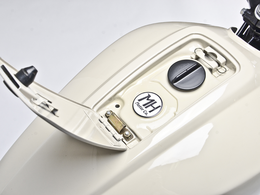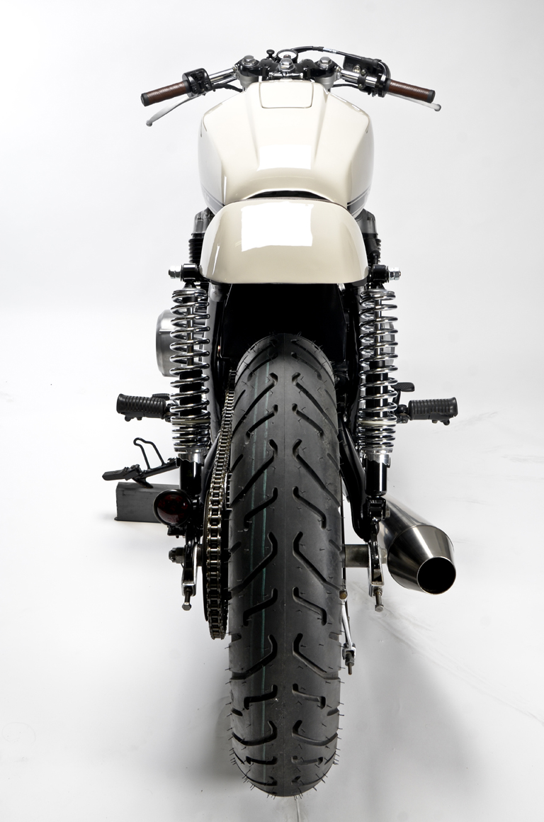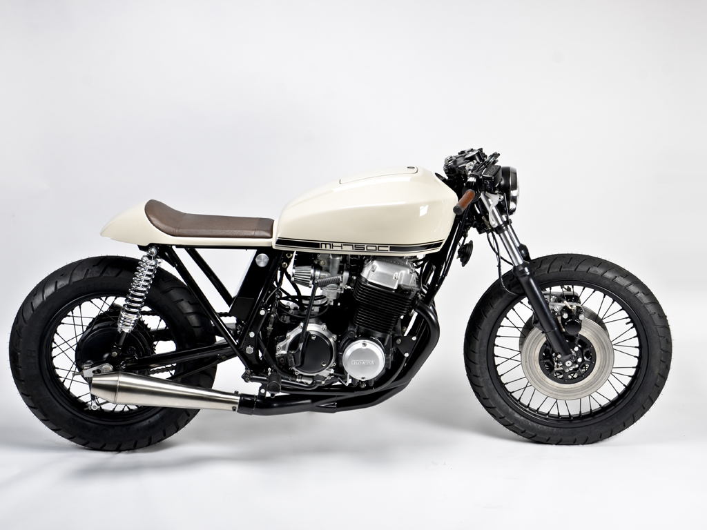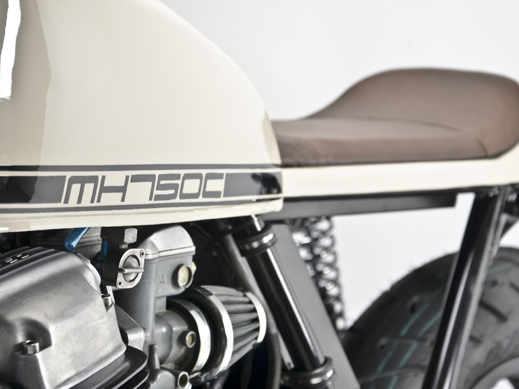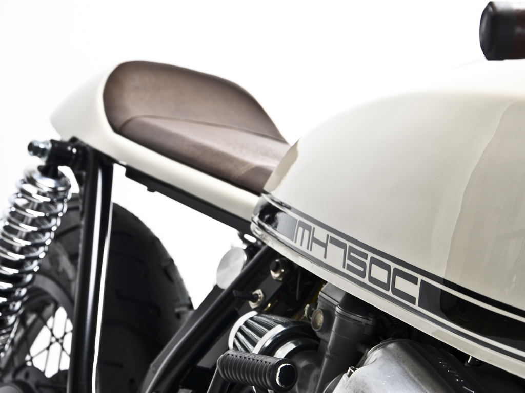 A 1977 Honda CB750 featuring, custom tail and leather seat, tucked mini headlight and MotoGadget speedo, clip-ons and leather wrapped hand grips. Front end lowered an inch and raised an inch in the rear. 4 into 1 headers and stainless steel reverse cone muffler. Carbs tuned with pod filters. Modern master cylinder and brake lines with dual front discs. MotoGadget mUnit and ballistic lithium battery with vintage aircraft push button and toggle switches. Porsche linen grey paint and stylized details.