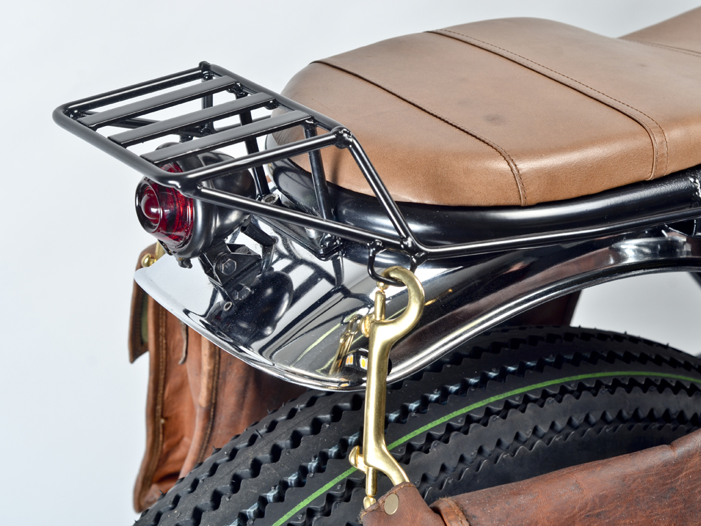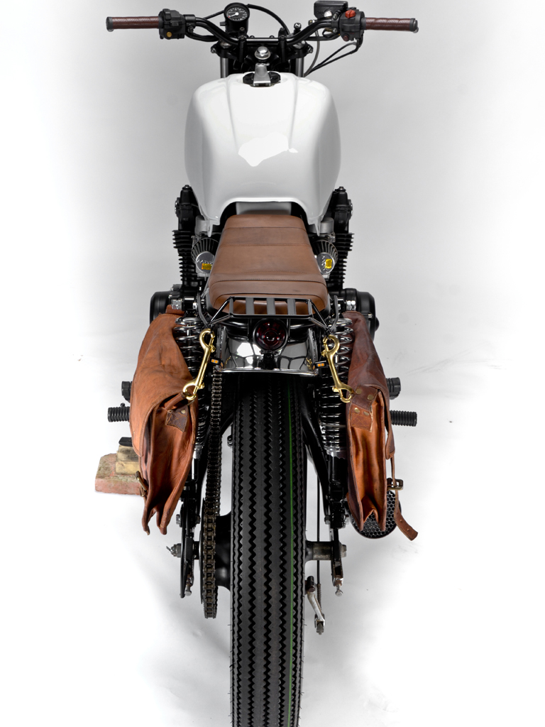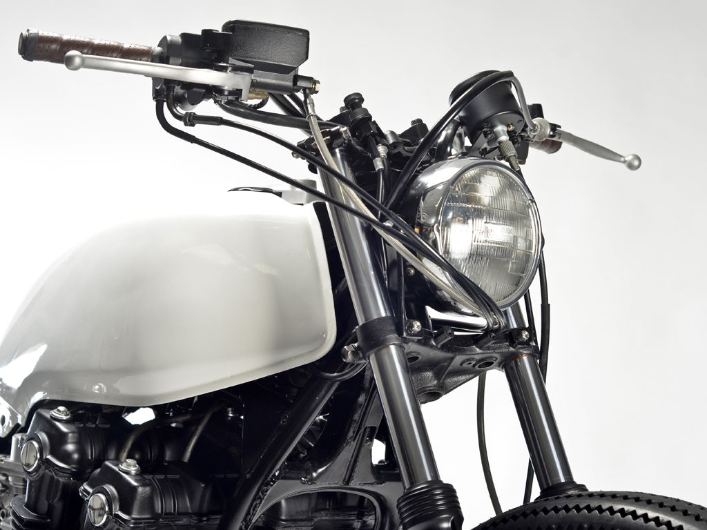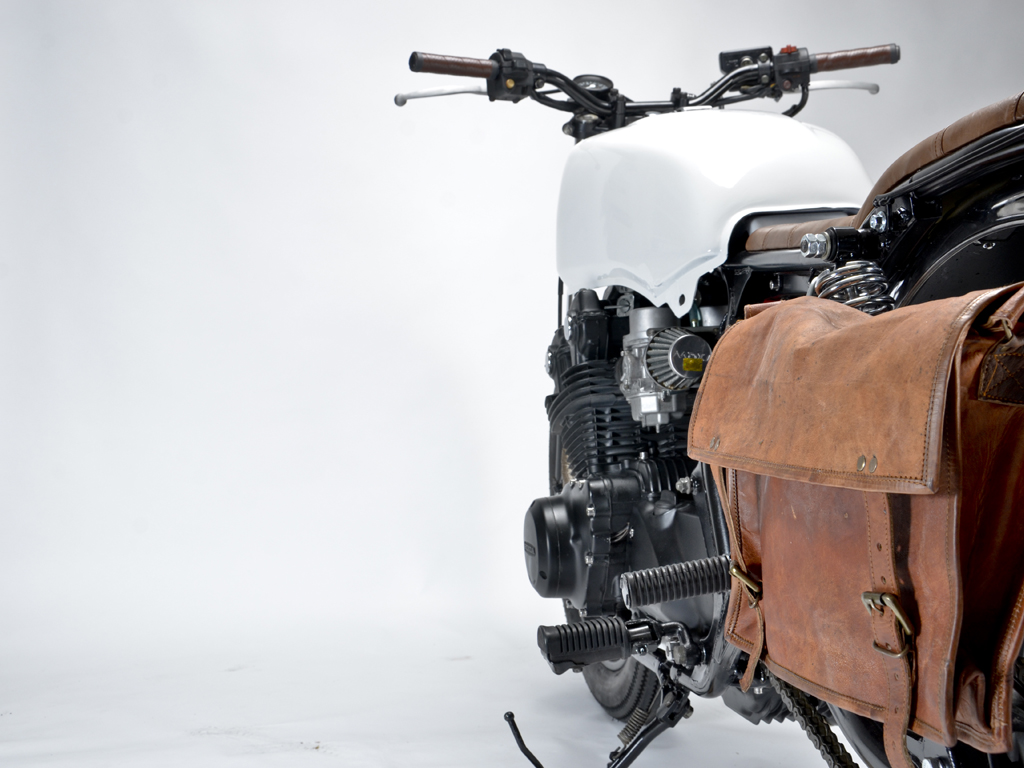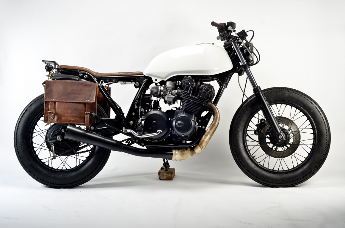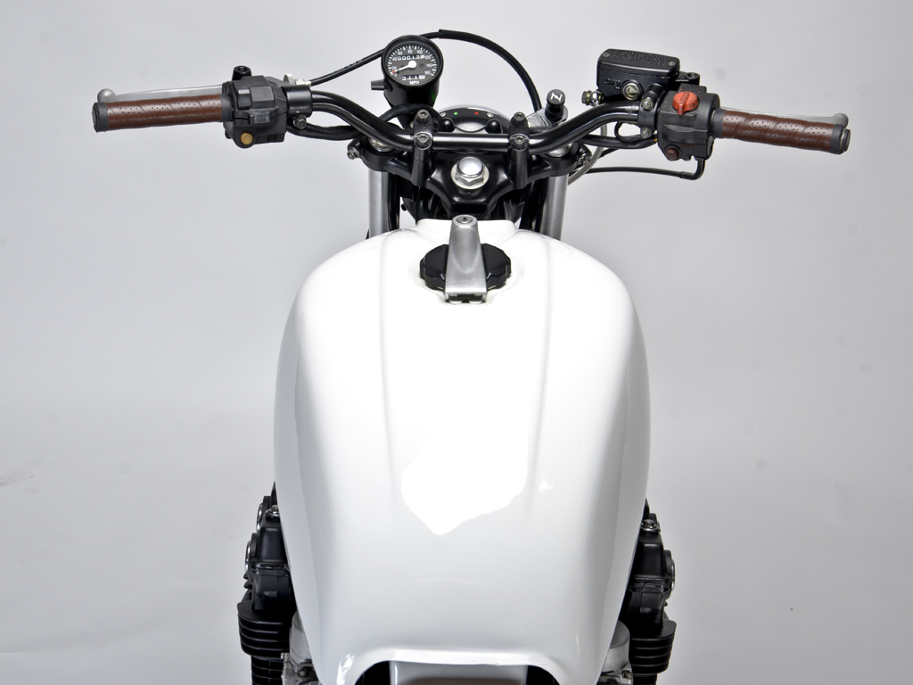 A 1980 Honda CB750 featuring, custom one off leather Brat style seat, tucked mini headlight and speedo, with miniature indicator LEDs inside headlight bucket. low rise bars and leather wrapped hand grips. 4 into 1 ceramic wrapped headers. Carbs tuned with pod filters. Modern master cylinder and stainless steel brake lines. Mini custom made rear luggage rack and side mount leather bags. Painted in a vintage white.