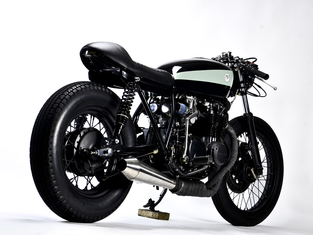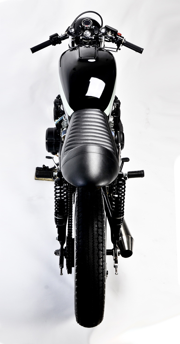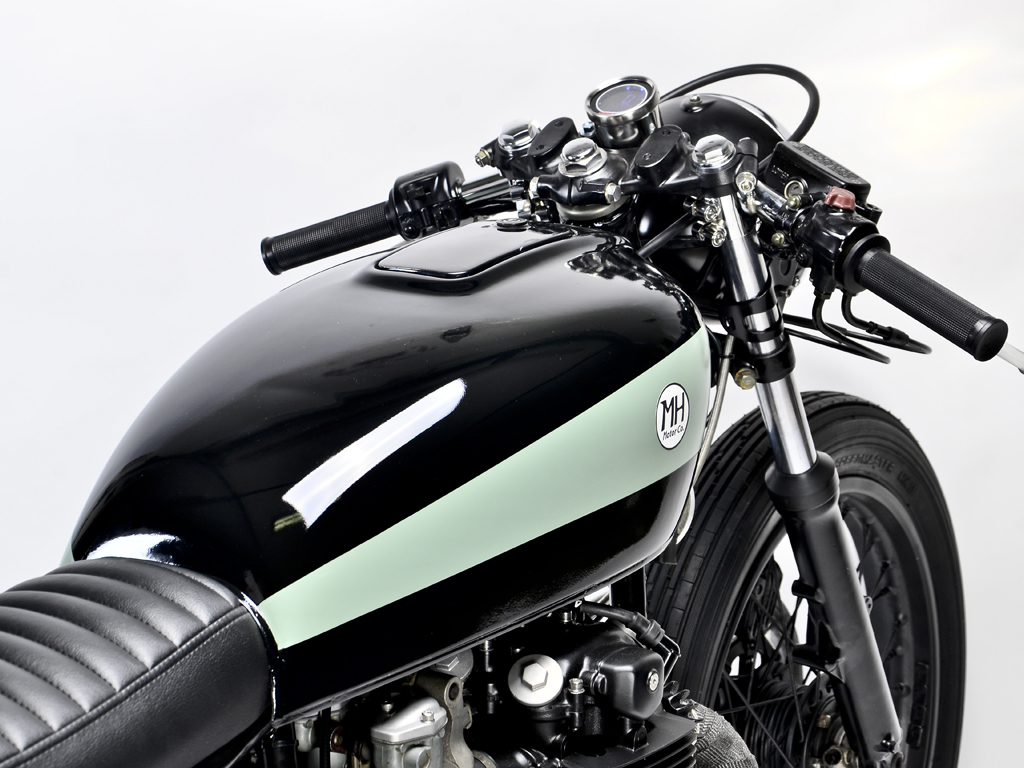 A custom 1976 Honda CB550. Full frame off restoration. Featuring a Moto Lanna seat. Custom 4 into 1 wrapped header and stainless steel reverse megaphone muffler. Koso digital speedometer, clipons and tucked headlight, rear taillight with integrated turn signals. Pod style air filters and rejetted carbs. Painted in gloss black paint with vintage matte green accents. Riding on Avon Tyres wrapped around a 19" front and 16" rear.