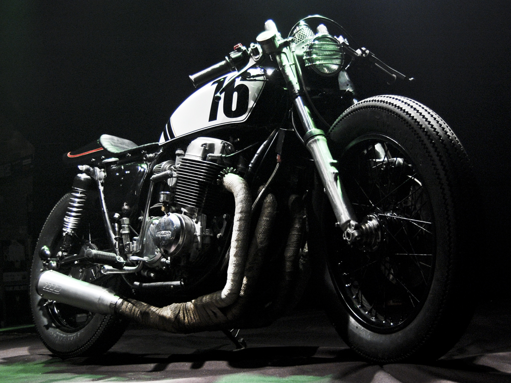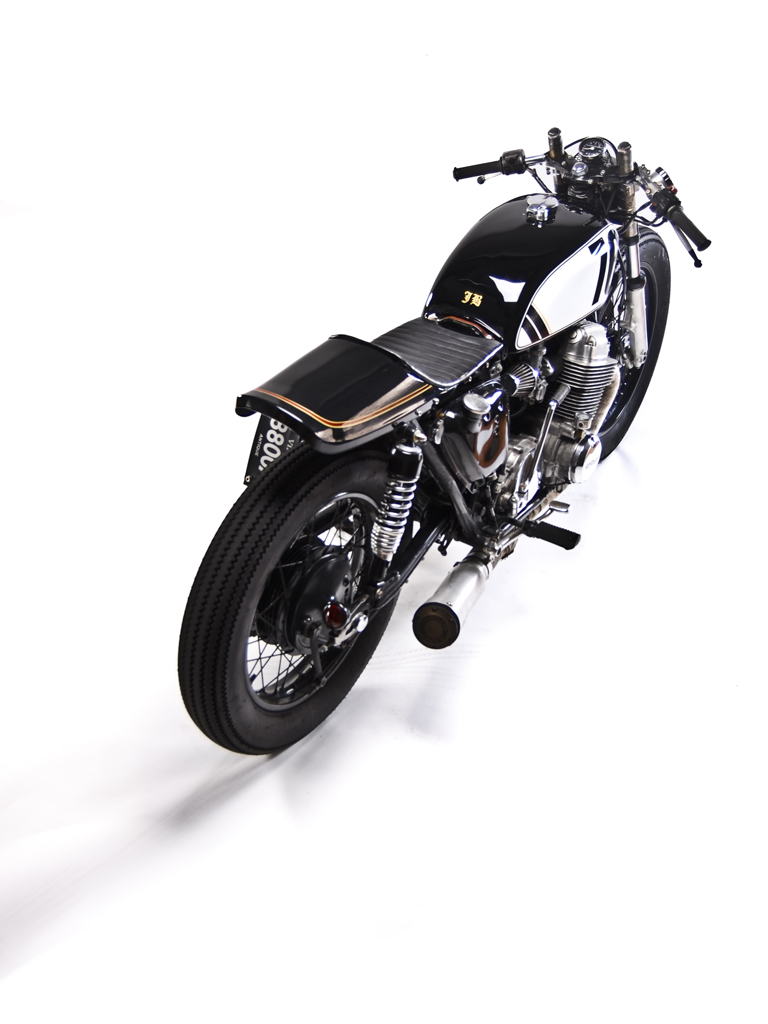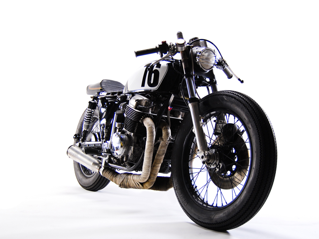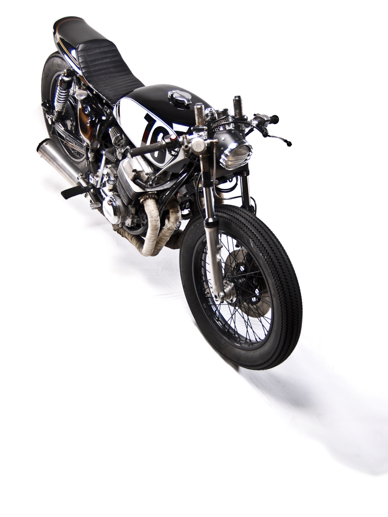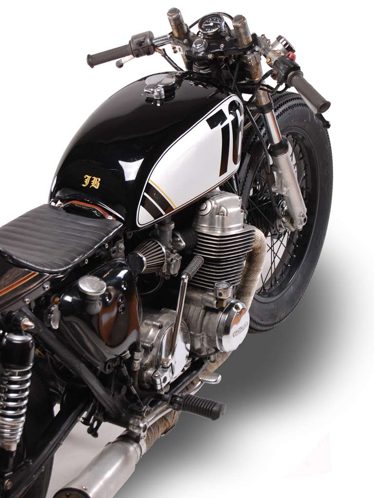 Jon's daily ride, a 1976 Honda Cb750. Modifications include, suzuki trials headlight with h4 bulb, mini mesh tach cover, kawasaki kz tail, jet black paint, low profile leather seat and leather tank strap. Ceramic header wrap, super trapp exhaust. Powder coated wheels wrapped in firestone tires.