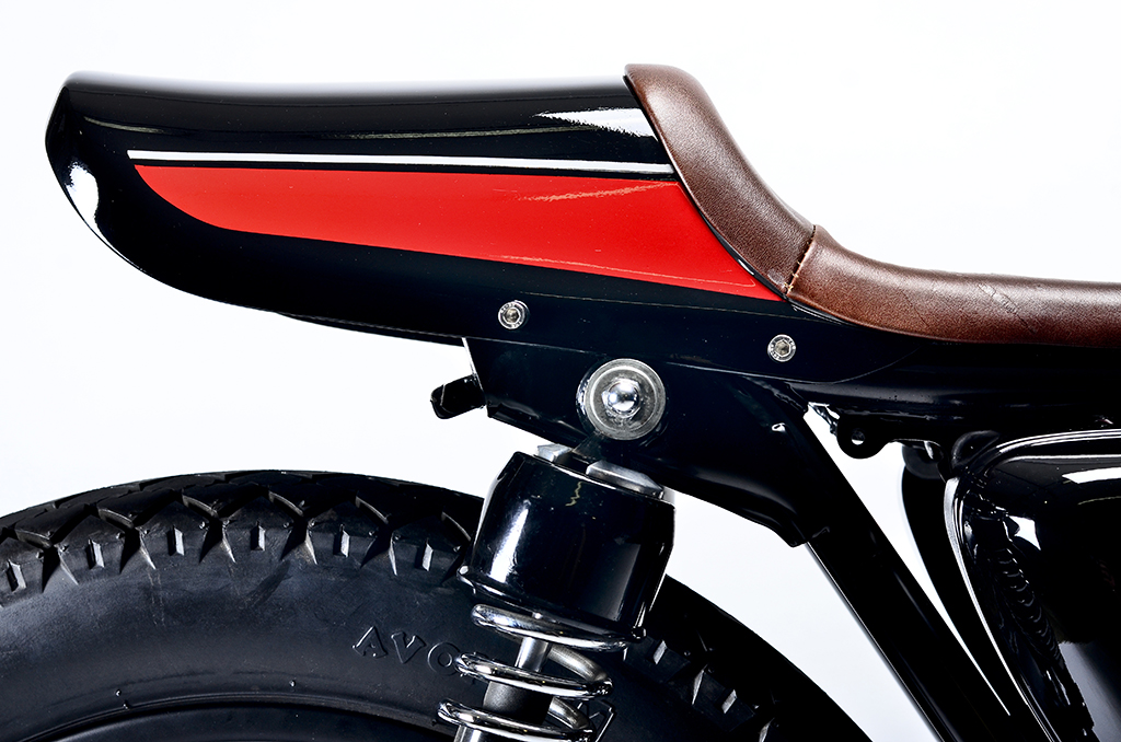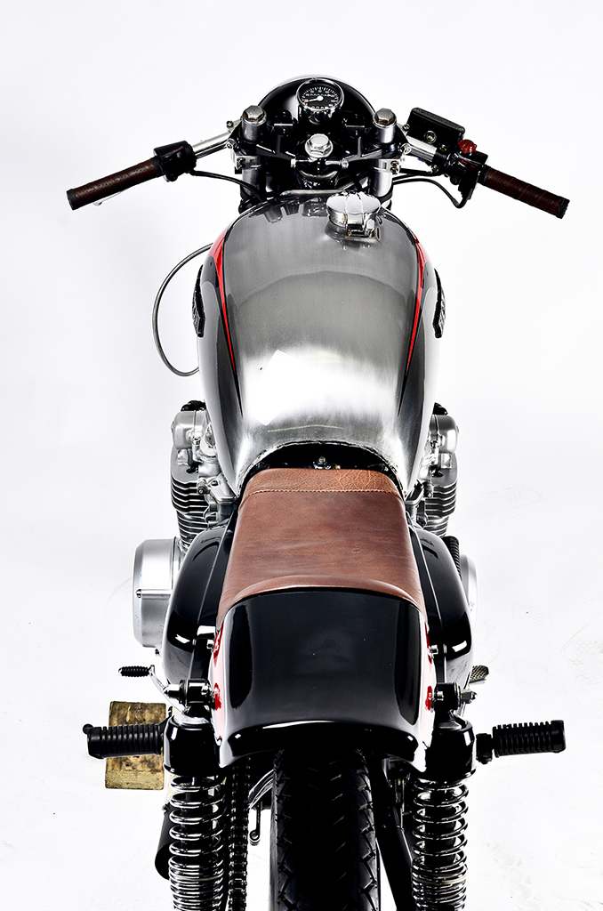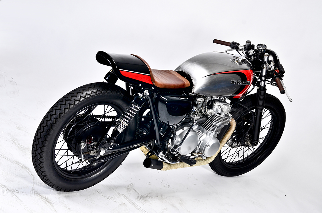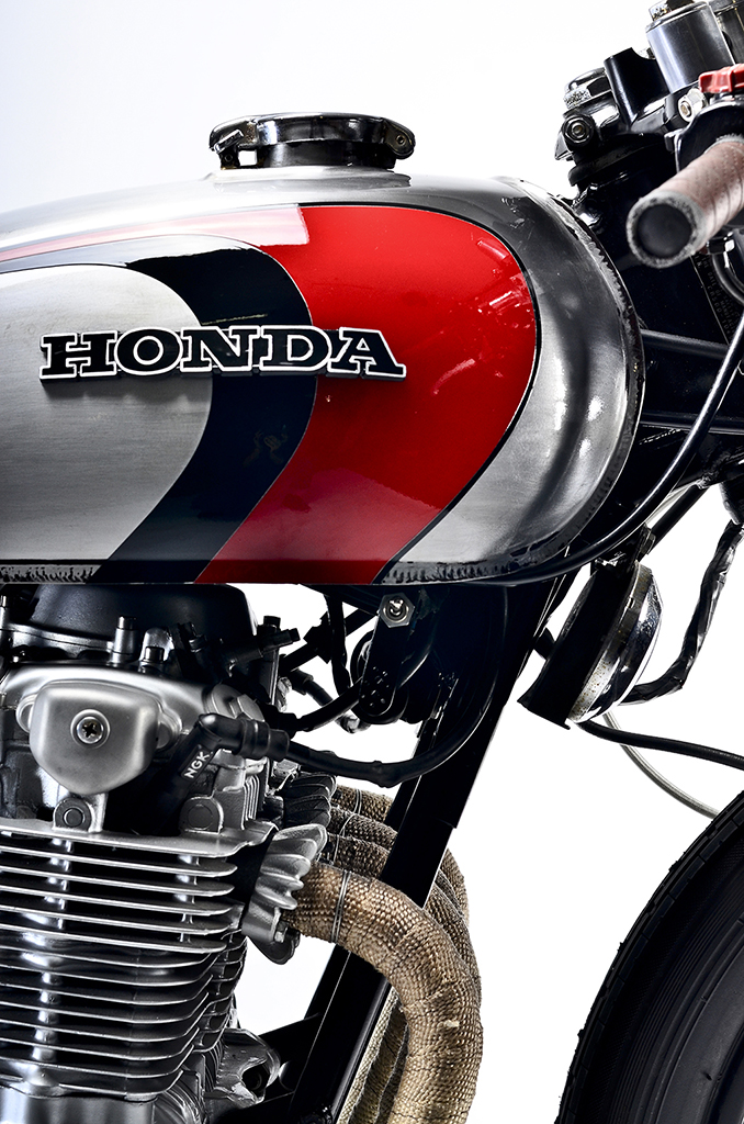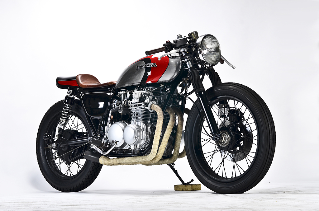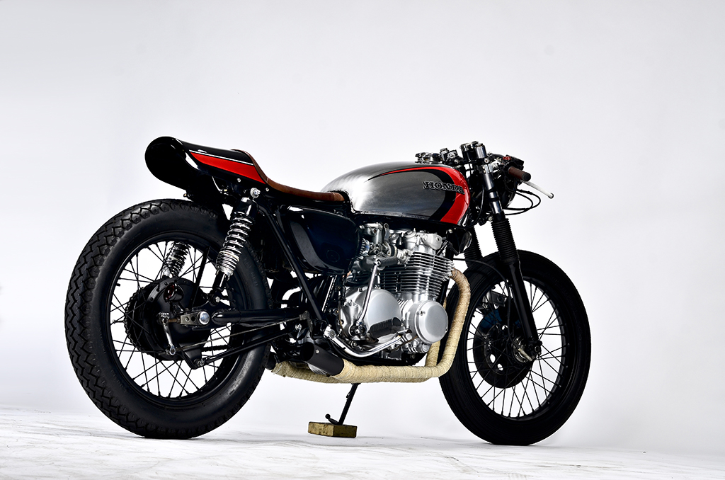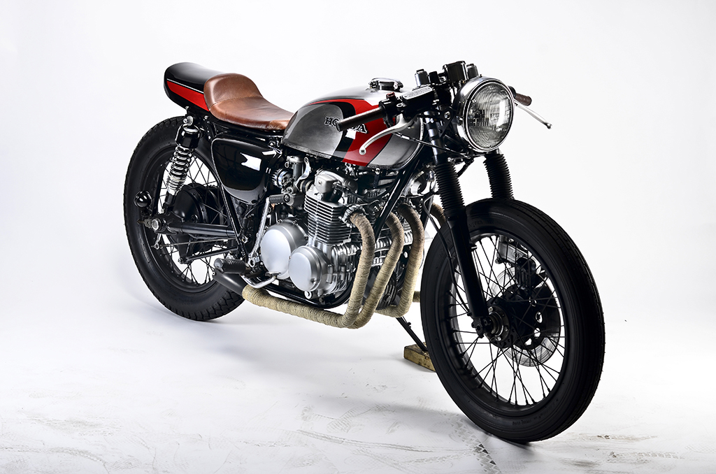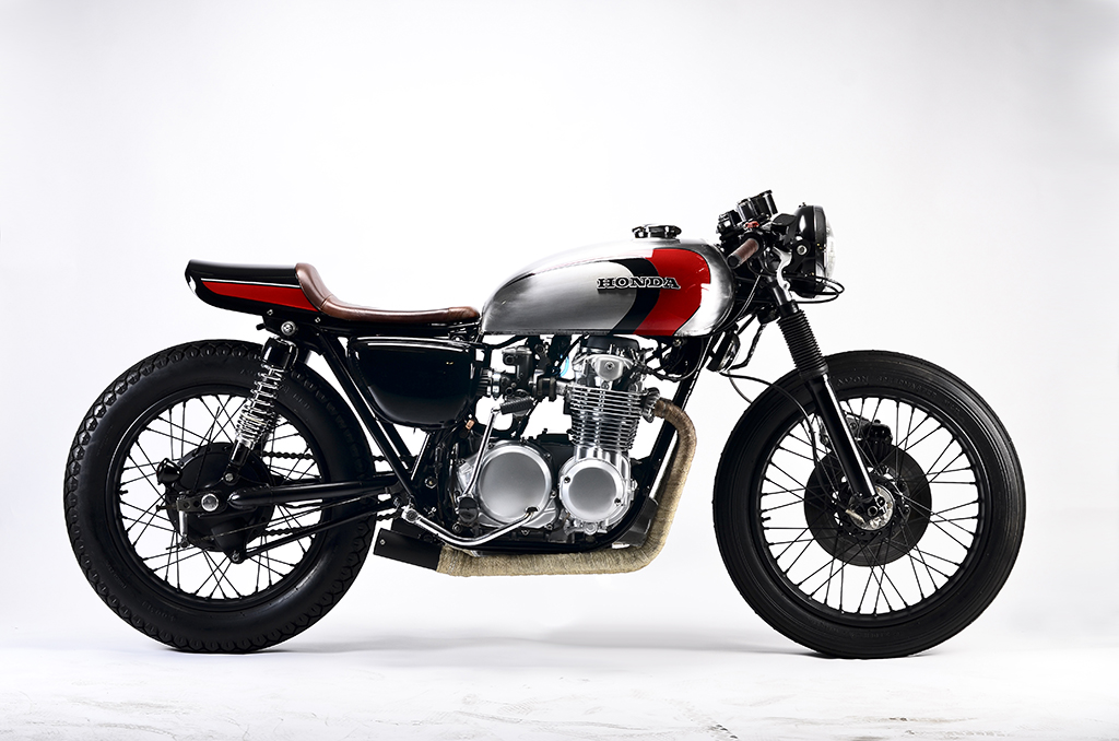 A custom 1974 Honda CB500. Full frame off restoration and powder coated frame. Custom 2 into 1 headers on each side with mini internal baffles. Mini speedo, clipons and tucked headlight, mini bates style rear taillight. Pod style air filters and rejetted carbs. Painted in black, deep red and bare metal. Riding on Avon tires.