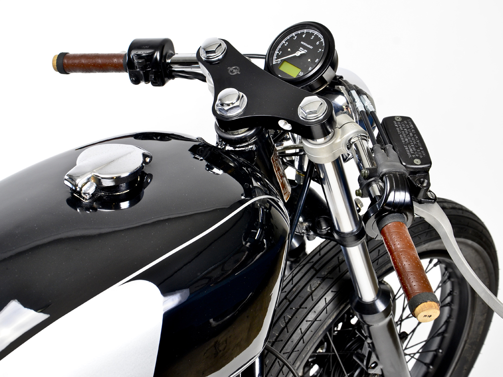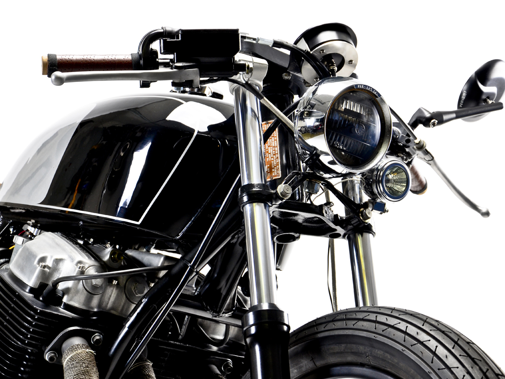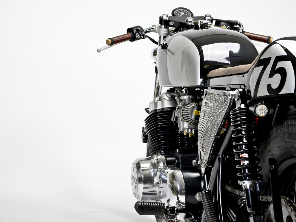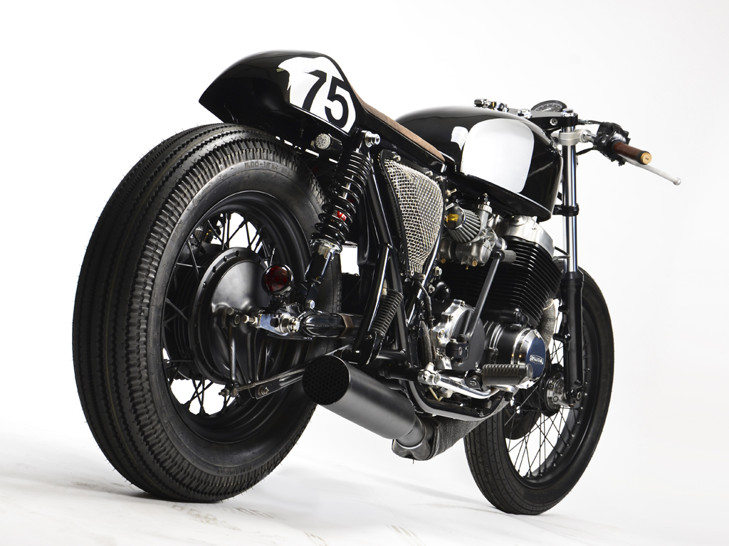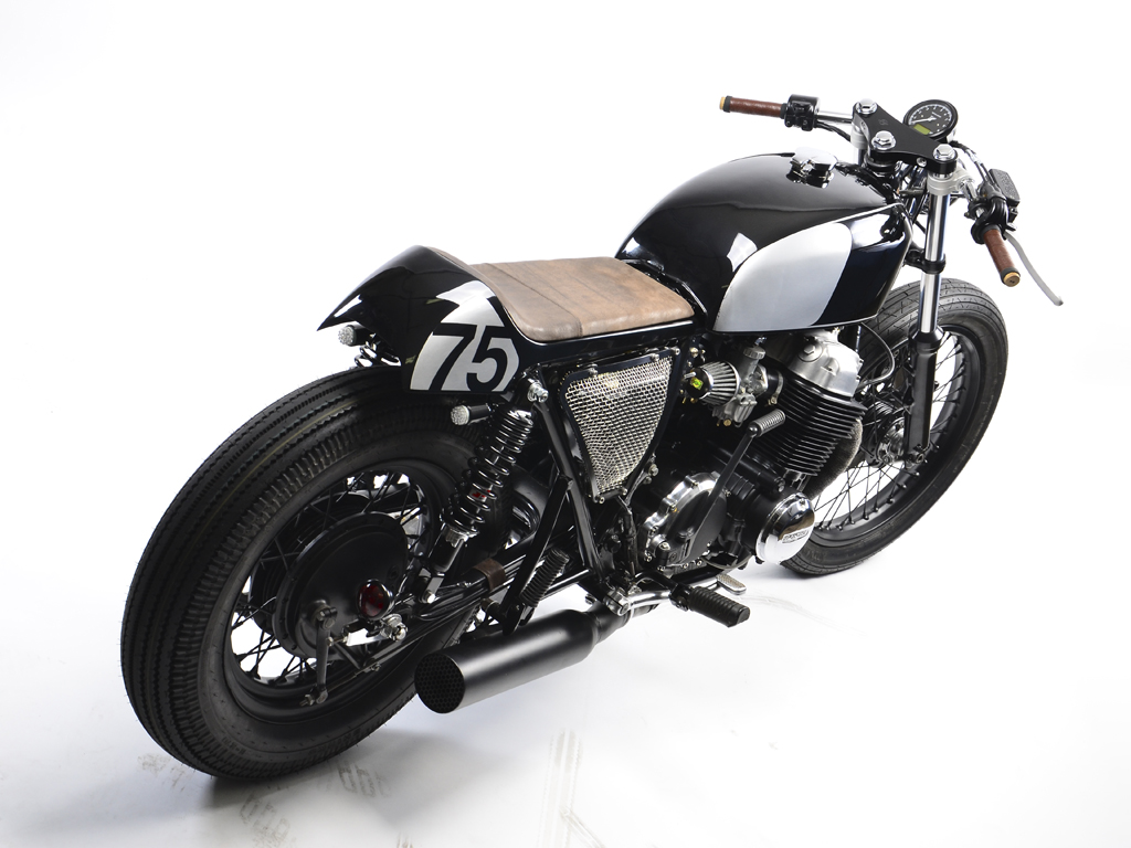 A 1975 Honda CB750 featuring, custom tail and leather seat with swappable 'Brat style' leather seat. Vintage driving headlight and mini fog/headlight. Clip-ons with leather wrapped hand grips. Front end lowered one inch and rear YSS shocks. 4 into 1 heat wrapped headers. Carbs tuned with pod style filters. Stainless steal mesh side covers. Modern master cylinder, stainless steel braided brake line and MotoGadget speedometer. Completed with a black and bare metal paint scheme.