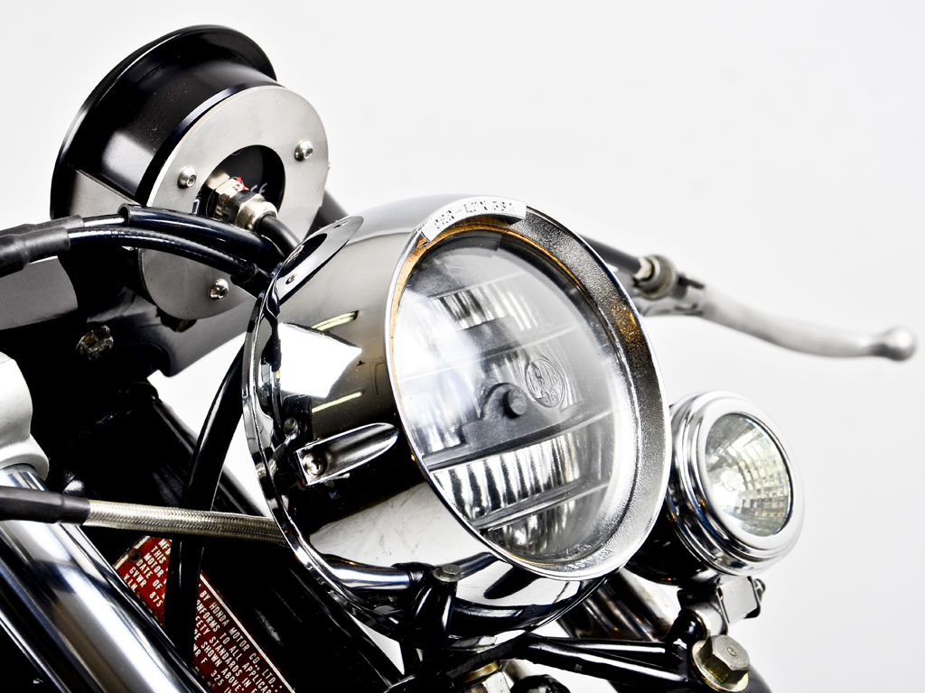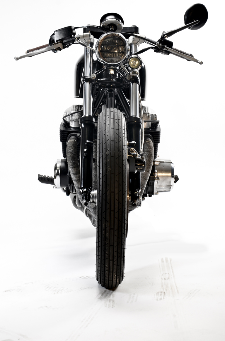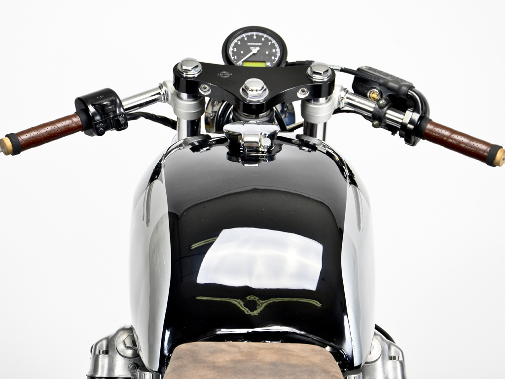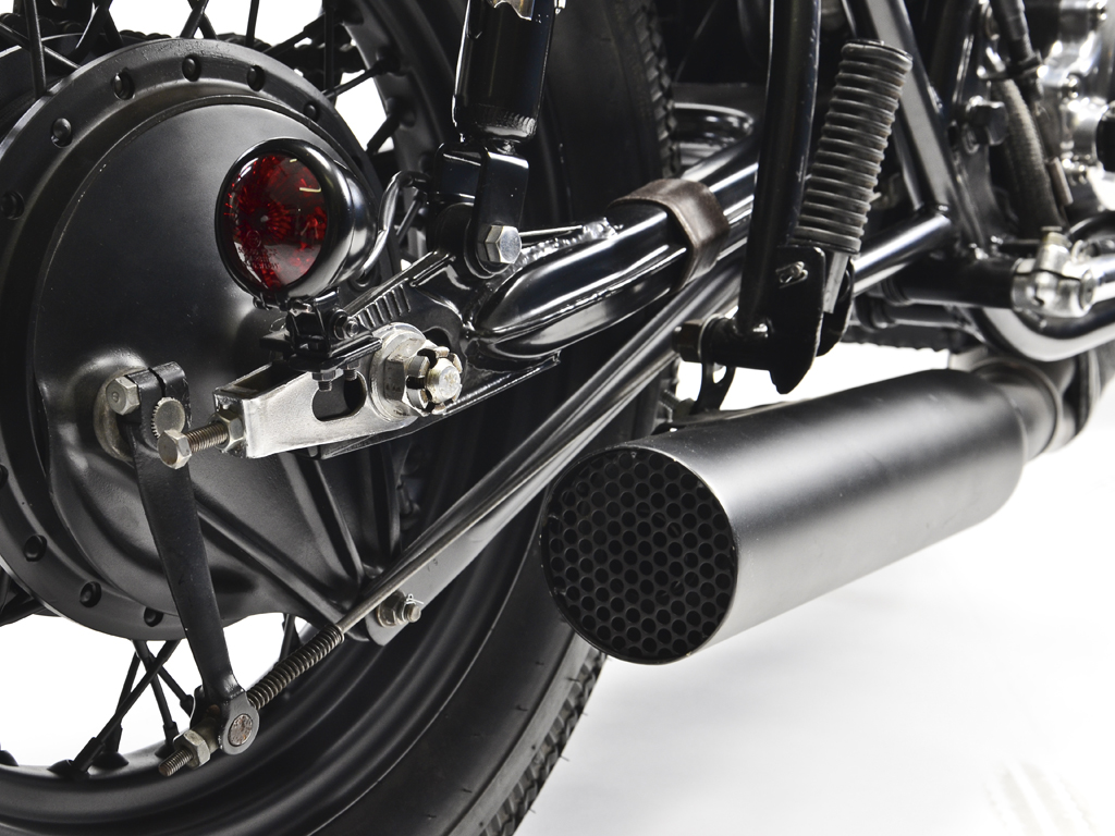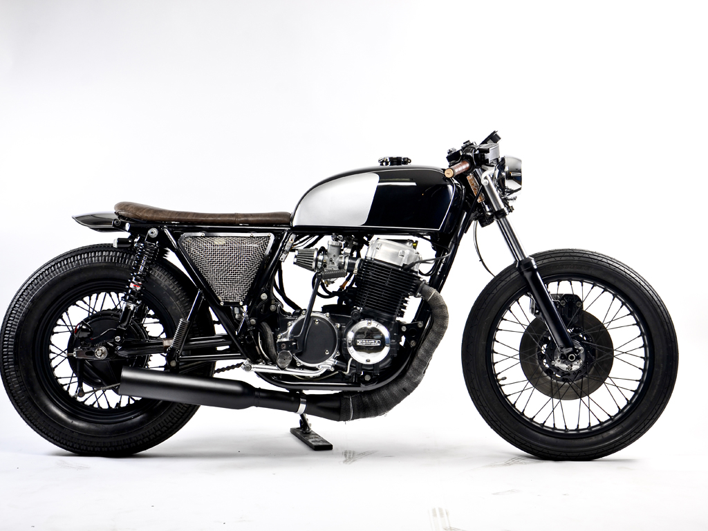 A 1975 Honda CB750 featuring, custom tail and leather seat with swappable 'Brat style' leather seat. Vintage driving headlight and mini fog/headlight. Clip-ons with leather wrapped hand grips. Front end lowered one inch and rear YSS shocks. 4 into 1 heat wrapped headers. Carbs tuned with pod style filters. Stainless steal mesh side covers. Modern master cylinder, stainless steel braided brake line and MotoGadget speedometer. Completed with a black and bare metal paint scheme.