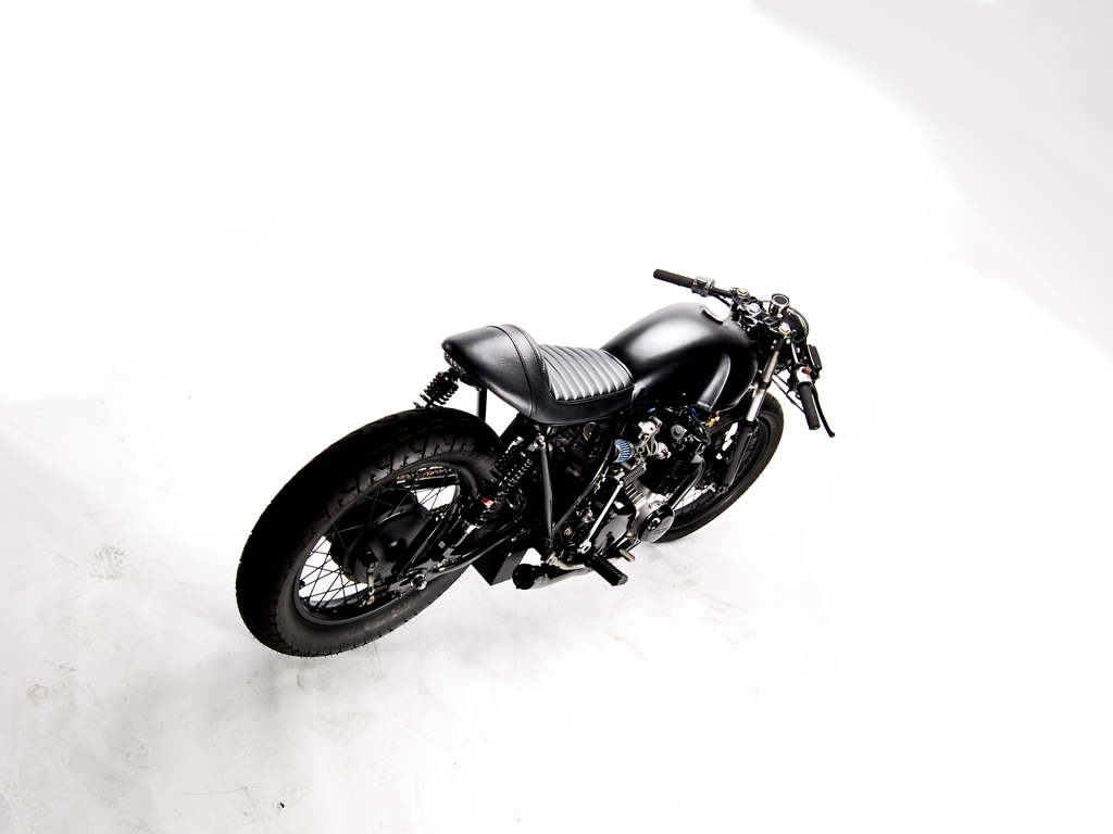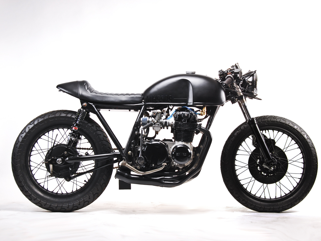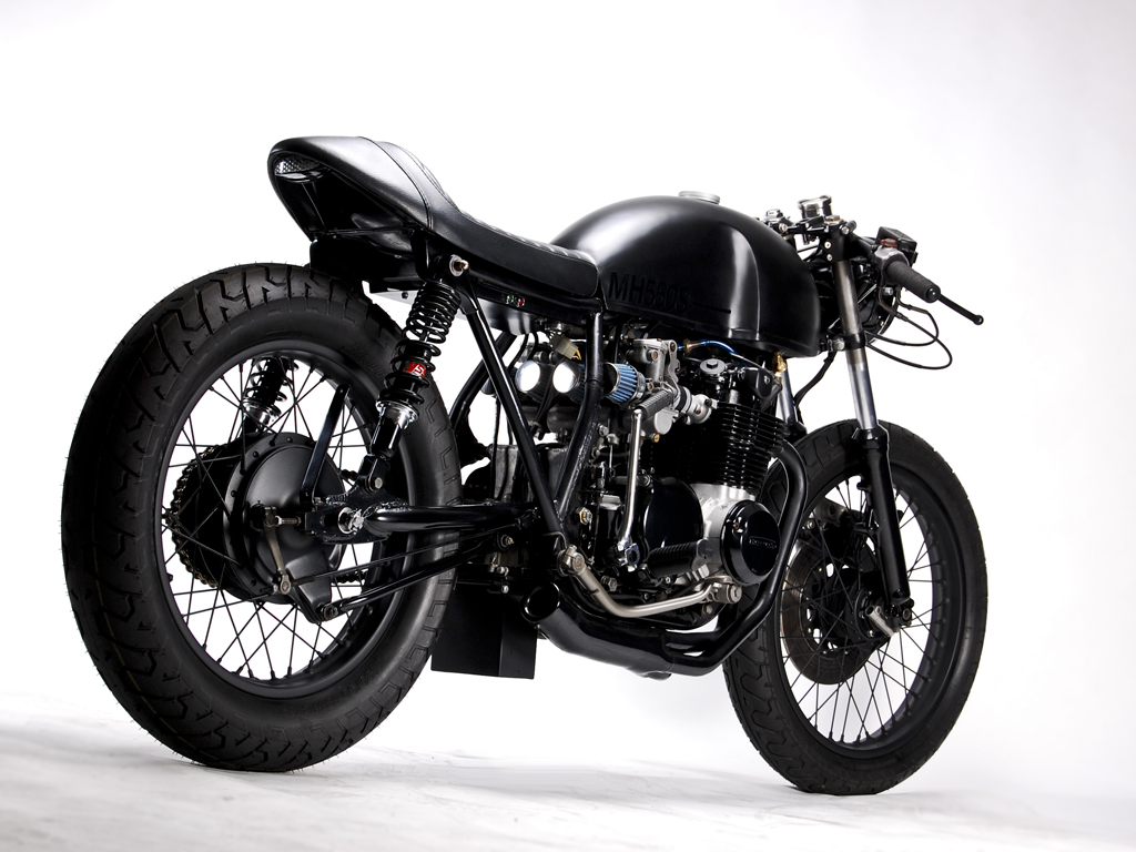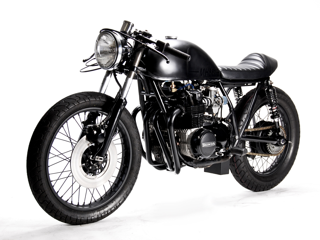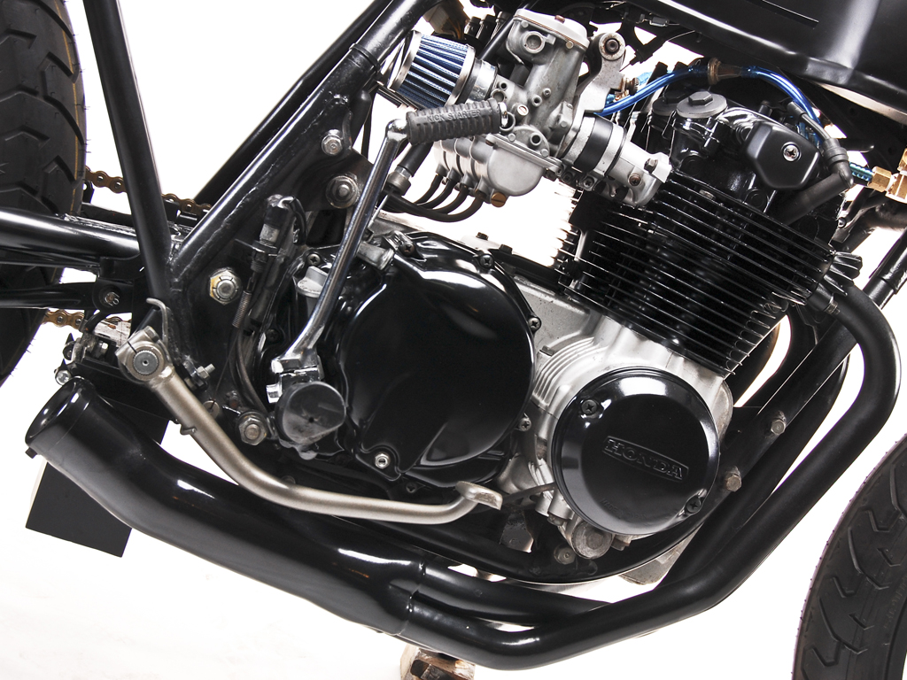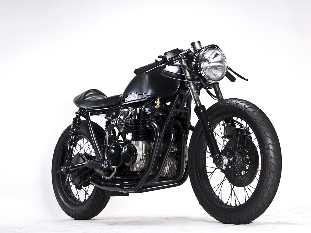 A 1976 Honda CB550 featuring a Benelli Mojave style tank and Moto Lanna seat. Custom shorty baffle installed on a 4 into 1 ceramic coated header. Koso digital speedometer, clipons and tucked headlight, rear taillight with integrated turn signals. Pod style air filters and rejetted carbs. Painted in satin black paint with gloss black accents and lettering. Riding on Bridgestone Spitfire Tires.
