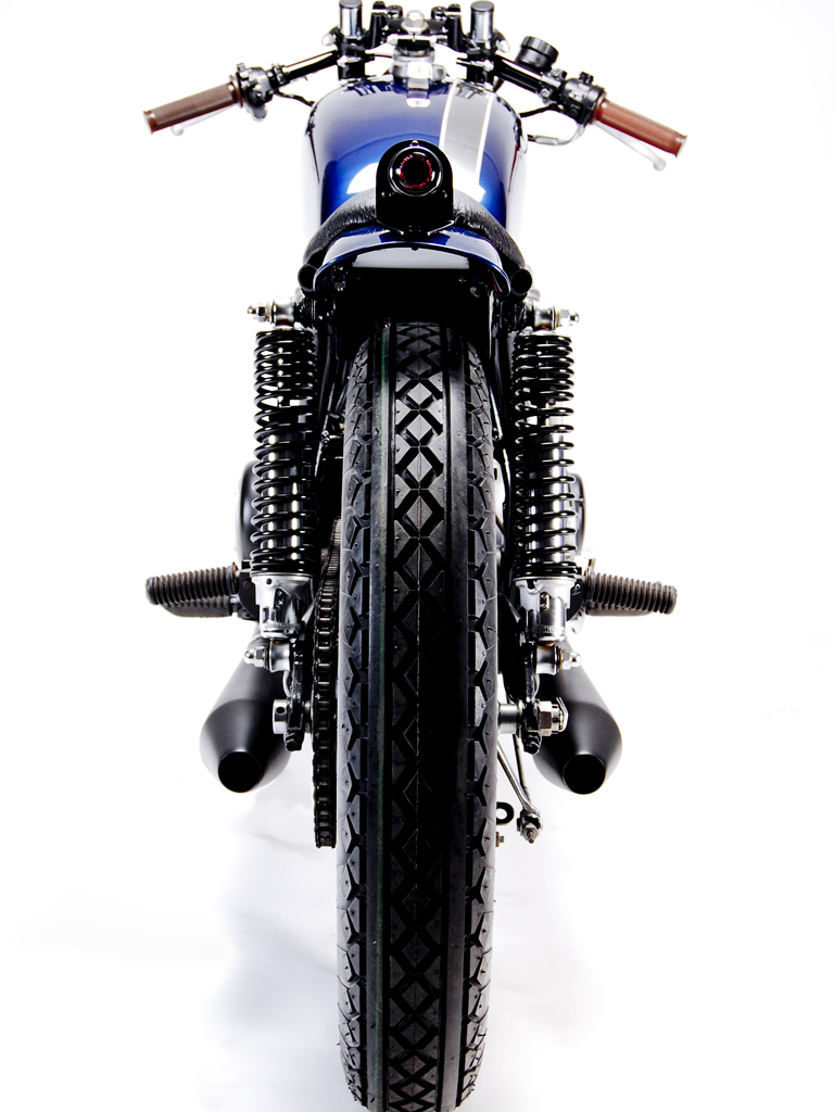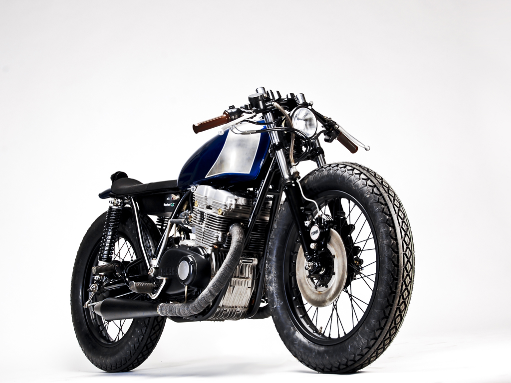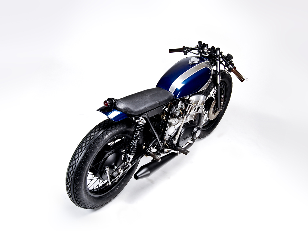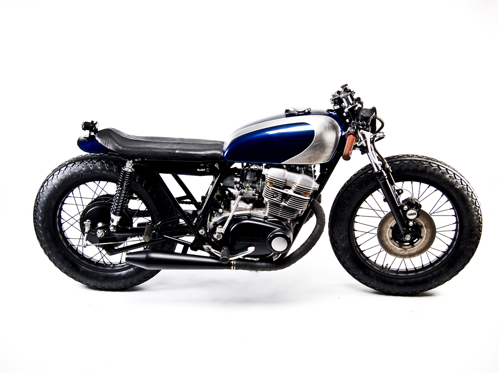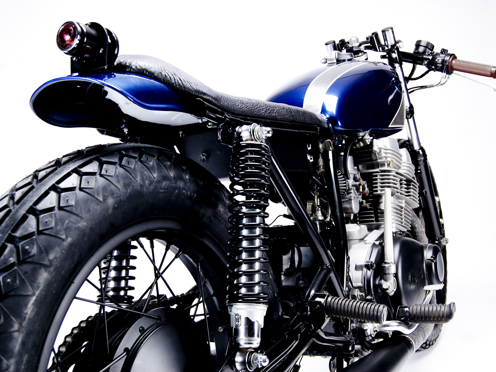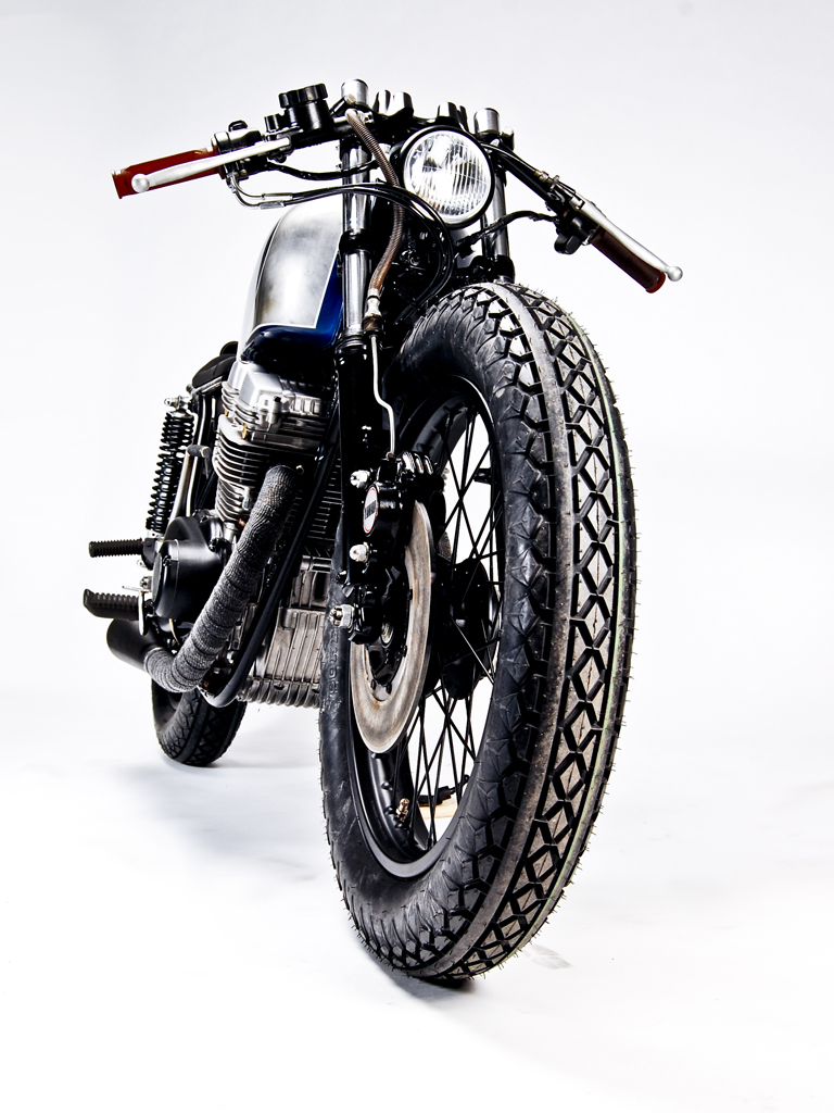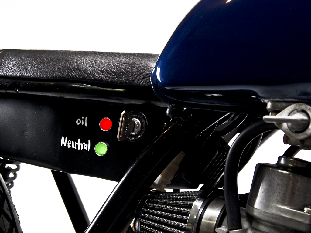 A 1974 Yamaha TX500 finished as a 'Brat' style custom bike. Small Bates style headlight and lucas cigar style taillight. Heat wrapped headers and reverse cone style mufflers. Custom battery box with handpainted details, housing the neutral and oil lights as well as the ignition switch. Riding on Coker Diamond tread tires.