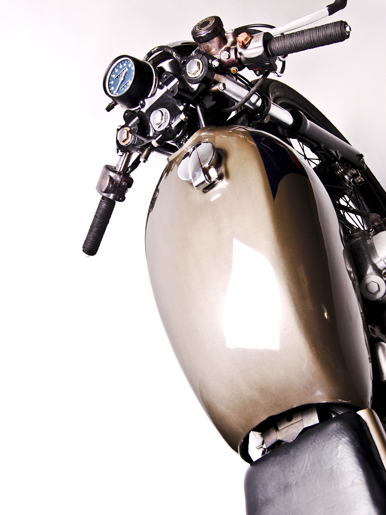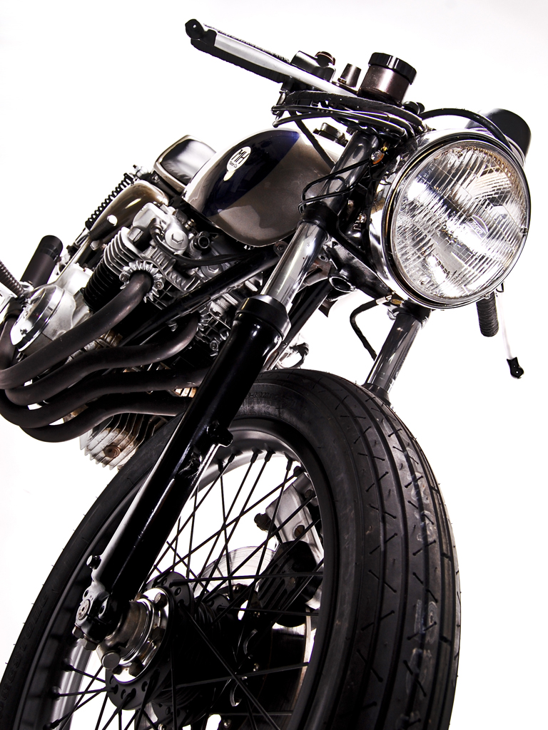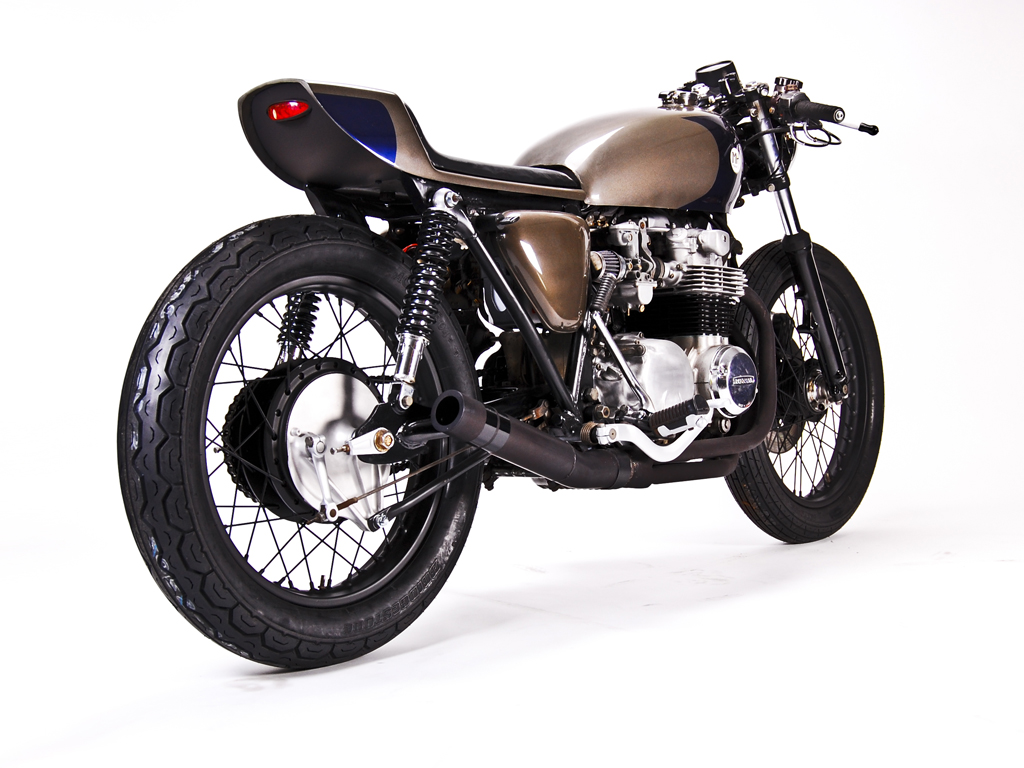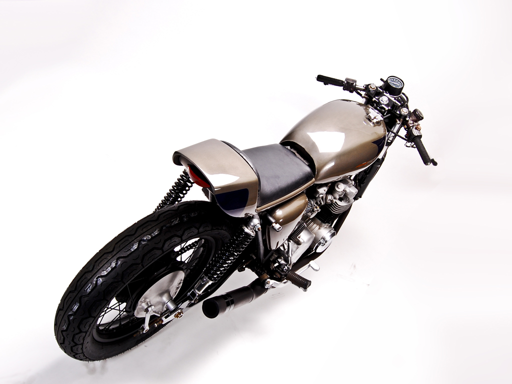 A 1977 CB550 Custom cafe racer. Handmade silencer with internal baffle, attached to the stock Super Sport headers. Custom one off tail fairing with integrated tail light and hand made seat. Lowered in the front 3/4". Headlight tucked in with custom brackets. Clip-ons, and lowered speedometer gauge from a cb 350. Conical style air filters. Painted with cast coat iron and stellar blue pearl.