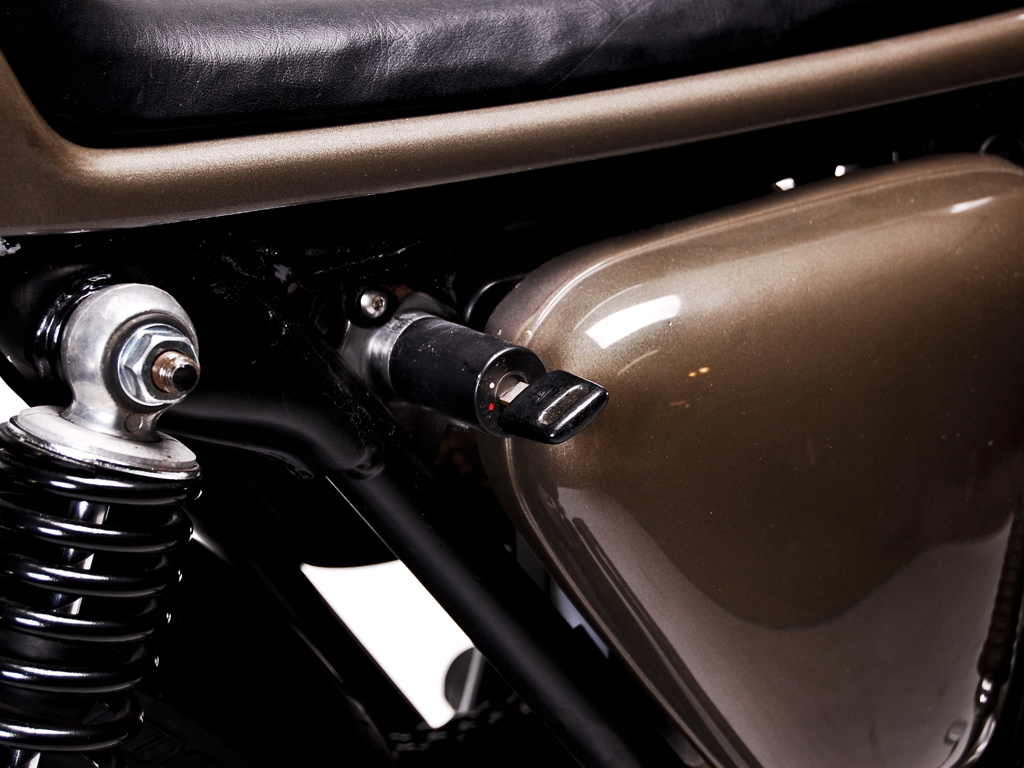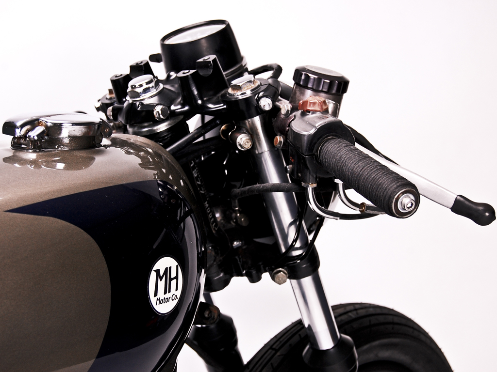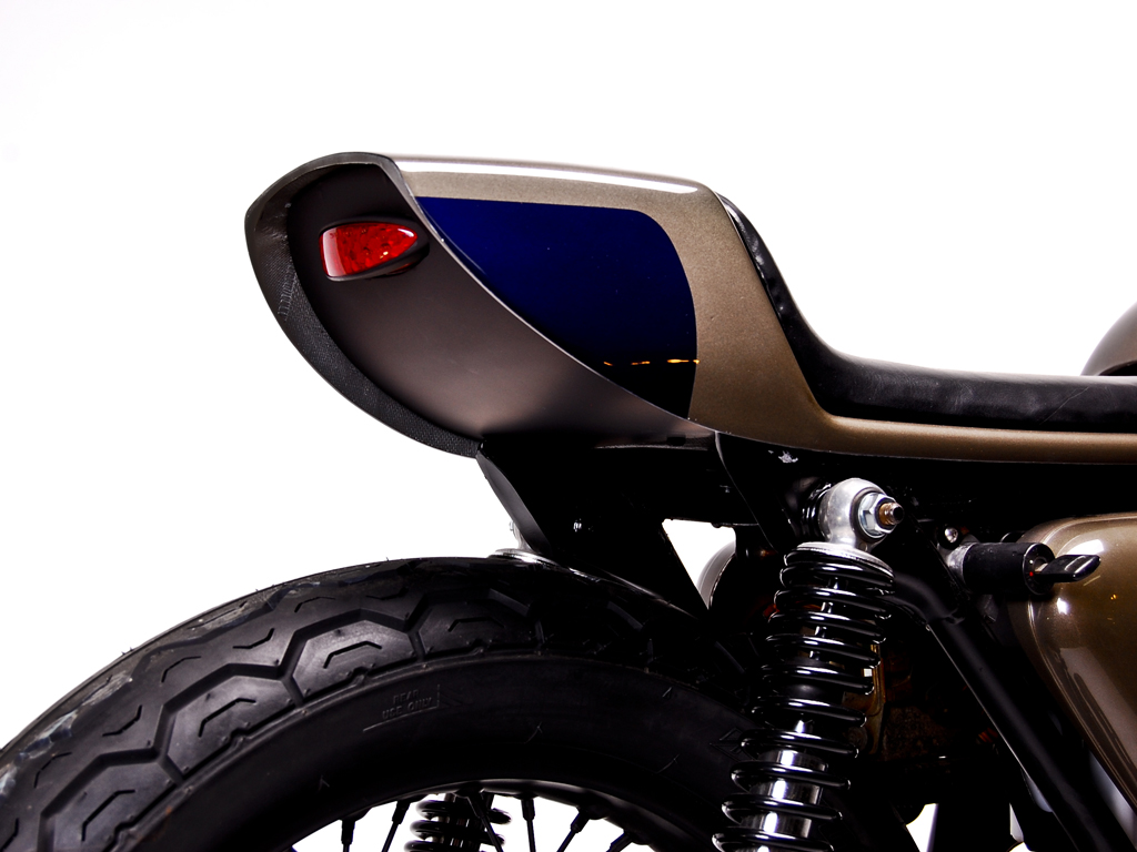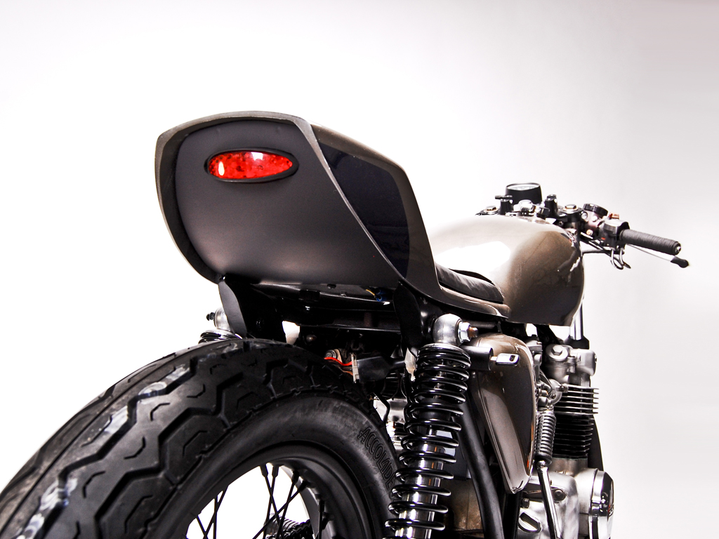 A 1977 CB550 Custom cafe racer. Handmade silencer with internal baffle, attached to the stock Super Sport headers. Custom one off tail fairing with integrated tail light and hand made seat. Lowered in the front 3/4". Headlight tucked in with custom brackets. Clip-ons, and lowered speedometer gauge from a cb 350. Conical style air filters. Painted with cast coat iron and stellar blue pearl.