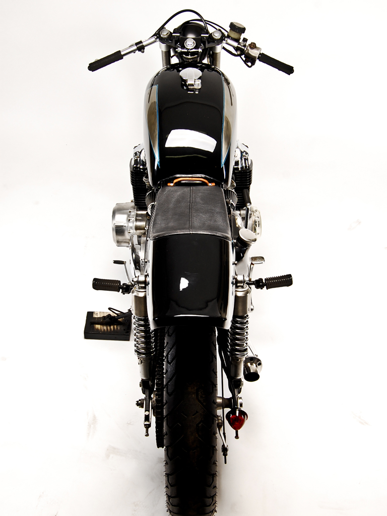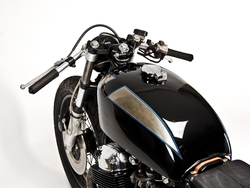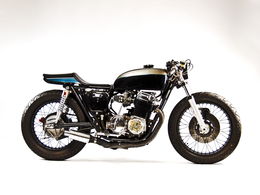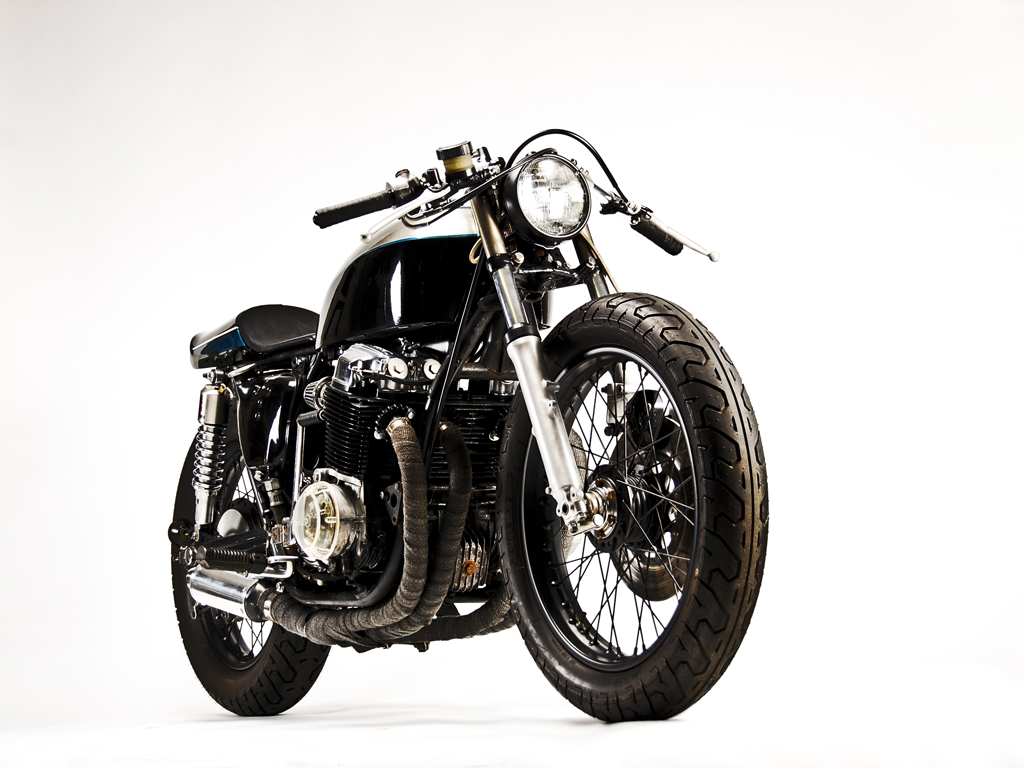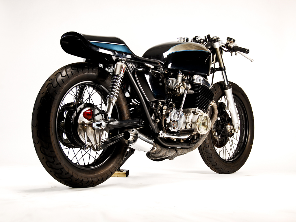 A 1976 Honda CB750 custom motorbike. Featuring Black metal and deep metallic green paint. 4 into 1 exhaust and shorty Vance and Hines muffler. Vintage Lucite points cover and amber back lighting. Clip-ons, small vintage fog light converted for h4 sealed beam headlight. Vintage leveler gas shocks in the rear, lowered about an inch in the front. Stainless braided front break line. A mix of chrome and brushed aluminum side covers and engine cases. Ignition switch and headlight switch relocated below the rear of the tank. Riding on Bridgestone Spitfire tires. Custom KZ tail and handmade leather seat.
