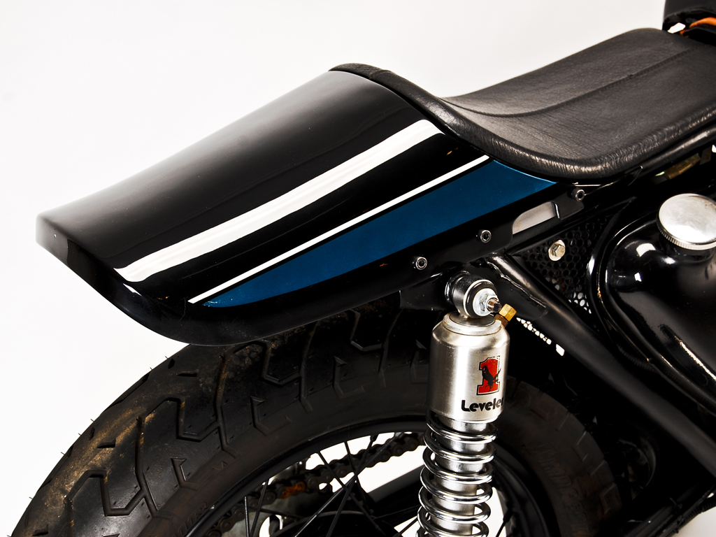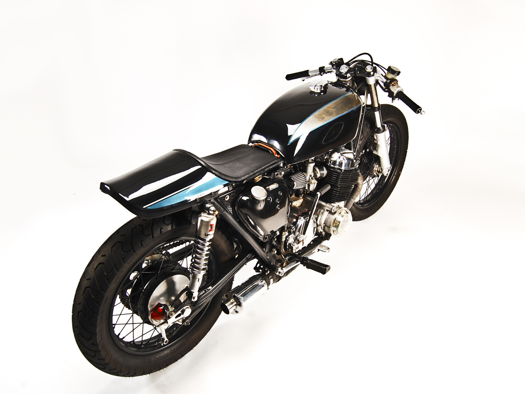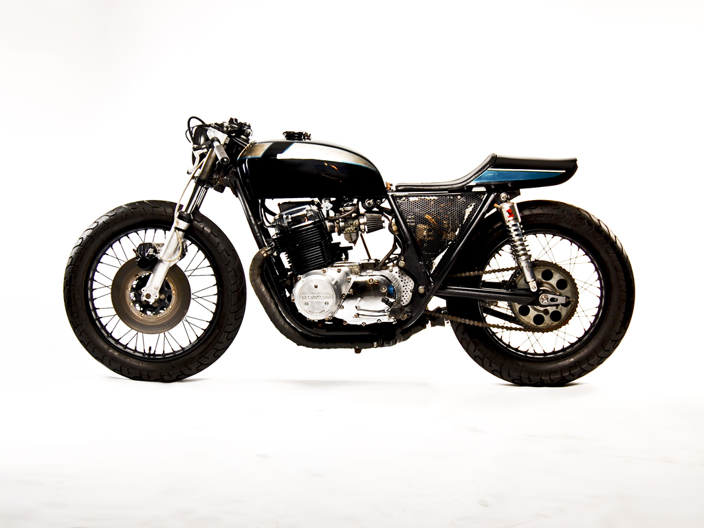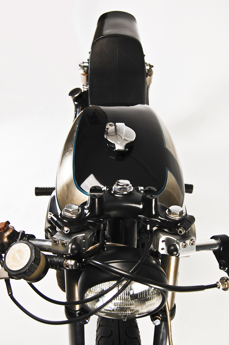 A 1976 Honda CB750 custom motorbike. Featuring Black metal and deep metallic green paint. 4 into 1 exhaust and shorty Vance and Hines muffler. Vintage Lucite points cover and amber back lighting. Clip-ons, small vintage fog light converted for h4 sealed beam headlight. Vintage leveler gas shocks in the rear, lowered about an inch in the front. Stainless braided front break line. A mix of chrome and brushed aluminum side covers and engine cases. Ignition switch and headlight switch relocated below the rear of the tank. Riding on Bridgestone Spitfire tires. Custom KZ tail and handmade leather seat.